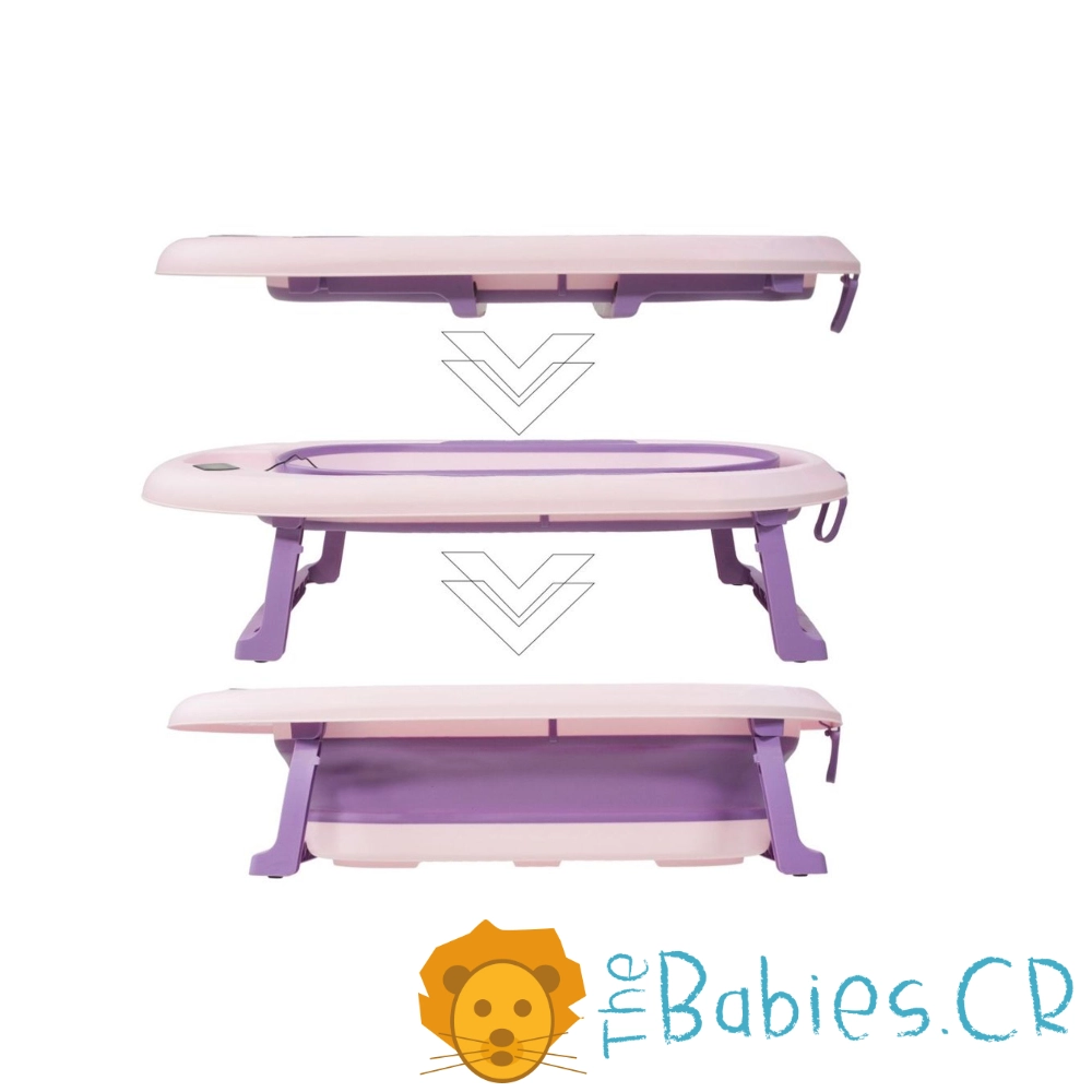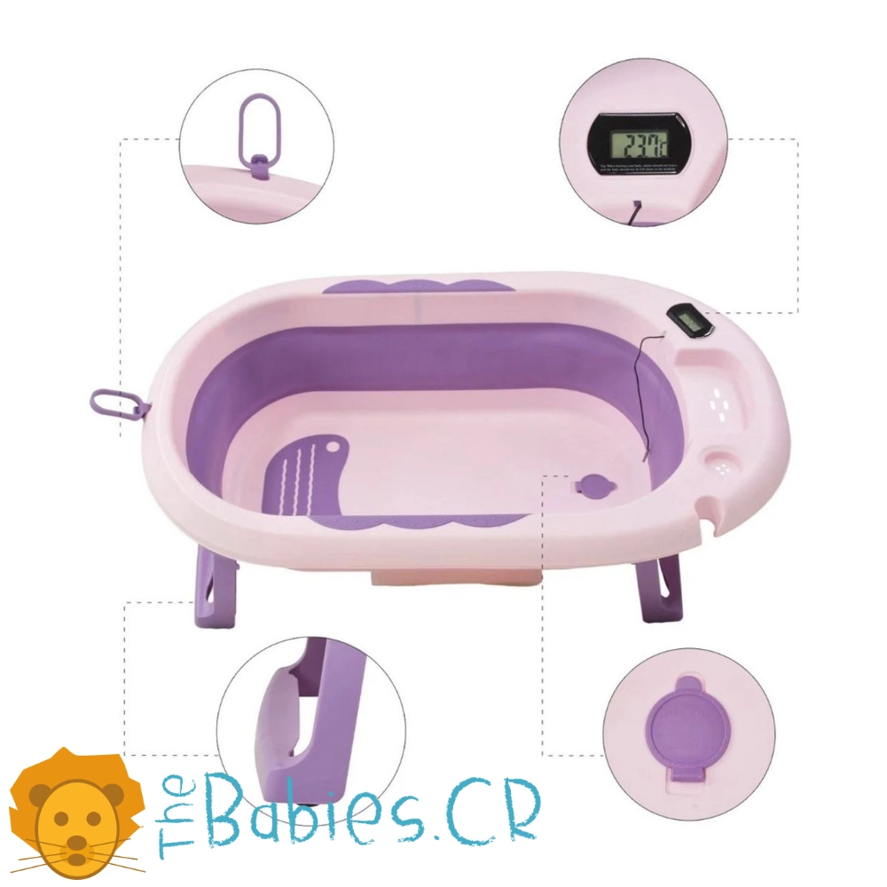– Bañera plegable morada para bebé con termómetro, respaldo ajustable y tapón de drenaje seguro.