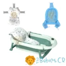 -Bañera plegable verde para bebé con termómetro, respaldo ajustable y tapón de drenaje seguro.