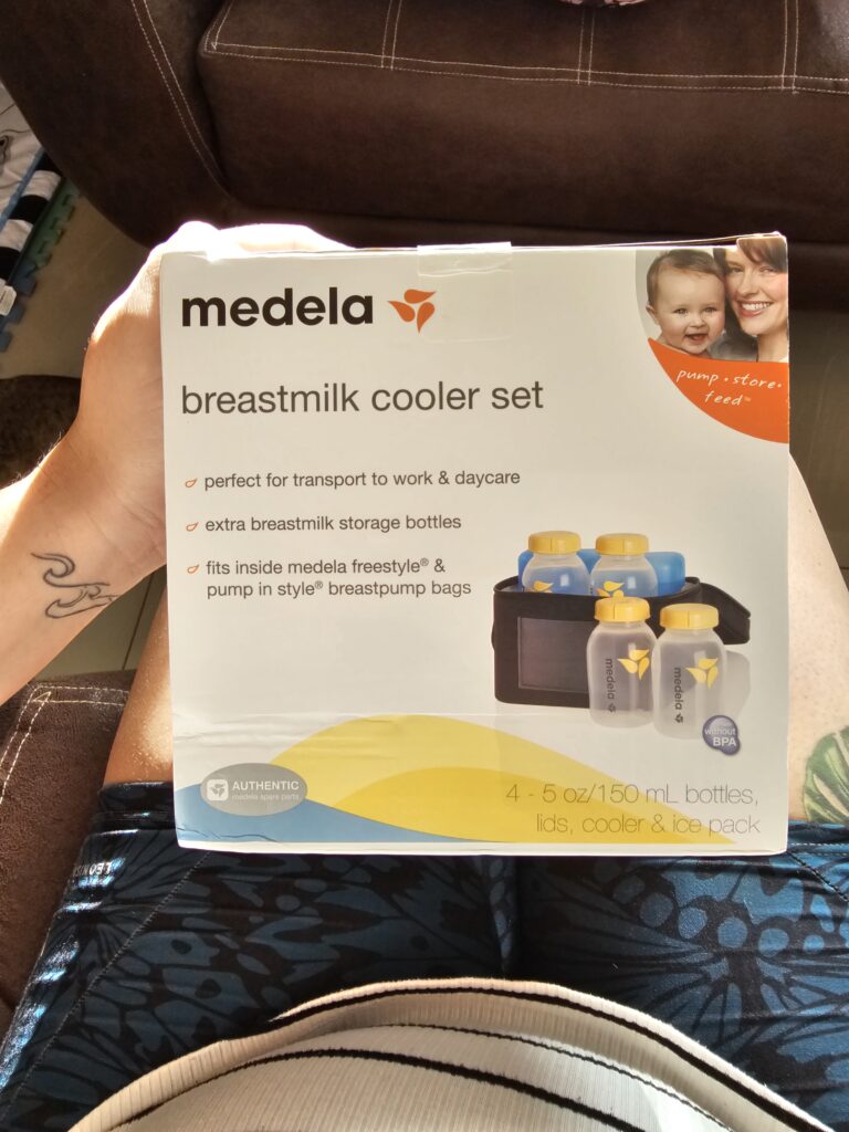 – 1 Set de hielera o cooler bag Medela de tela, paquete de hielo contorneado (ice pack), 4 botellas de 5 oz/150 ml y 4 tapas sólidas marca Medela.