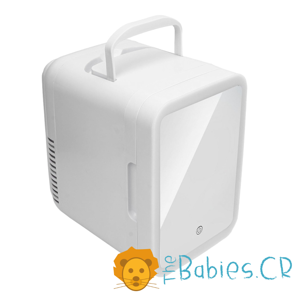 -1 mini refrigerador eléctrico portátil con espejo y luz exterior en el marco y rejilla divisoria.