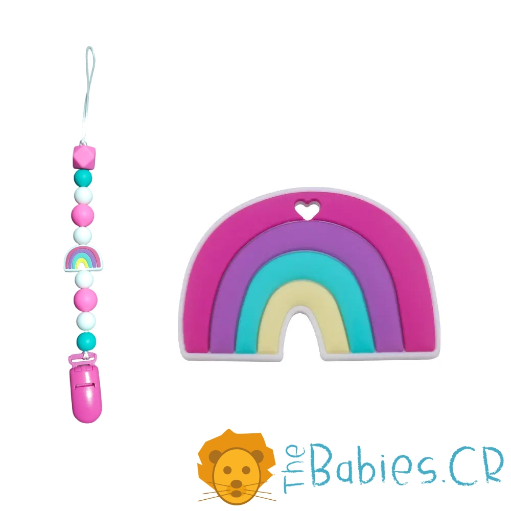 – 1 mordedor y 1 sujetador de chupeta con accesorios en forma de arcoiris.